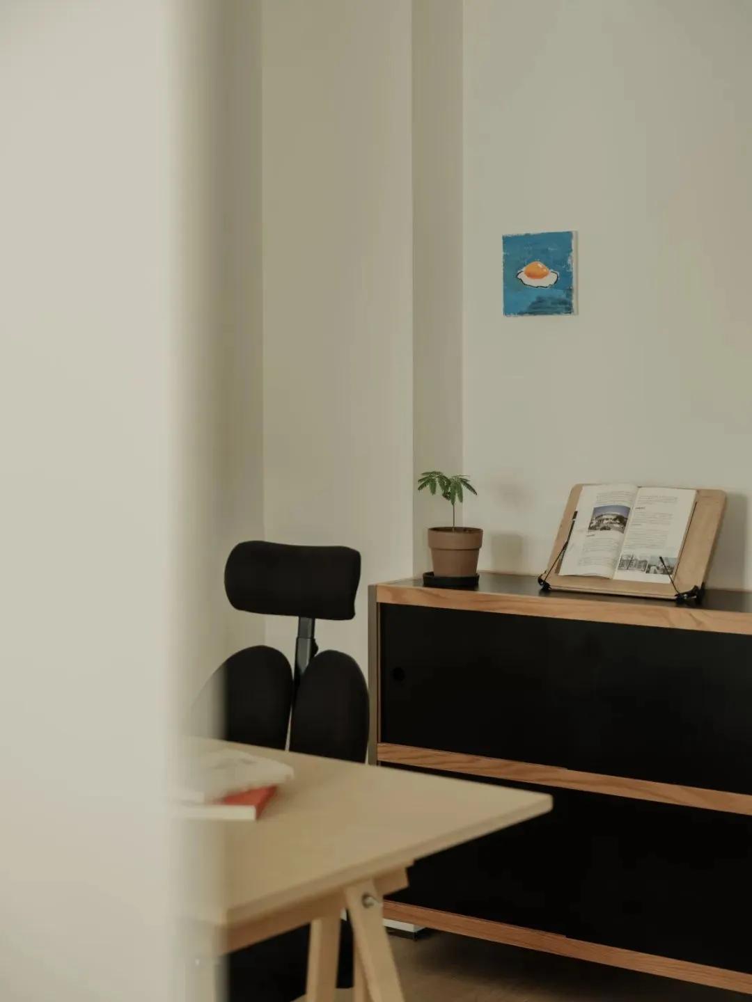 与之相对,内部办公区的处理则更具功能导向。设计师刻意降低了此处的天花高度,并统一采用了黑色台面的办公桌。这种设计策略旨在通过围合感与视觉的沉潜,为工作者营造更具沉浸感的人性化体验。不同的物理环境对人的影响是微妙而持续的,这一番显然经过深思熟虑的布局,更有利于团队成员集中注意力,从而更有效地激发创造性思考。