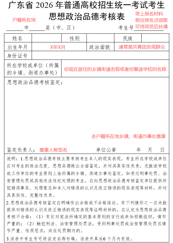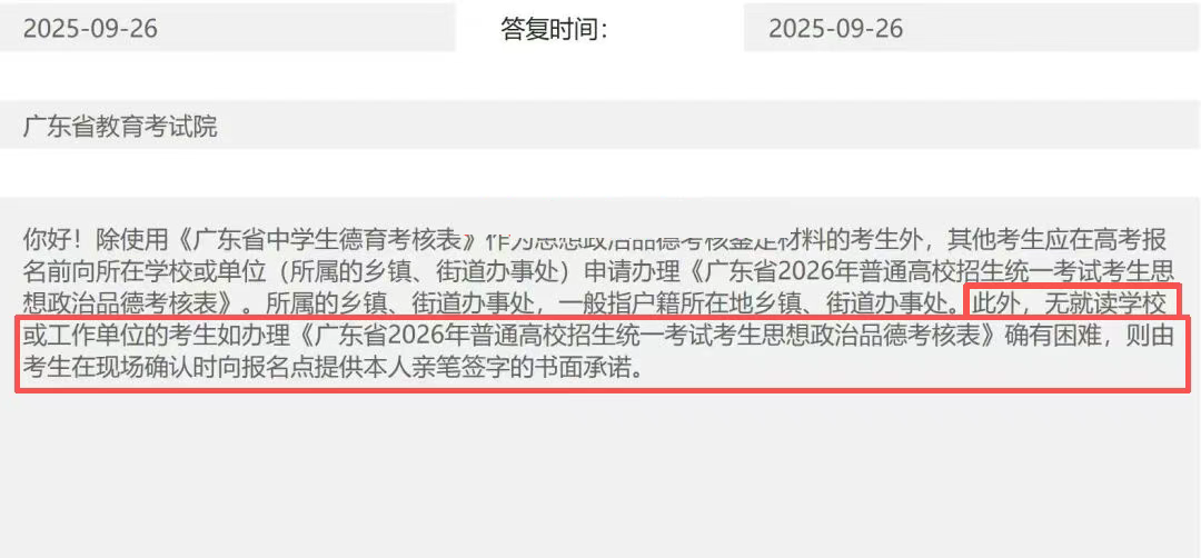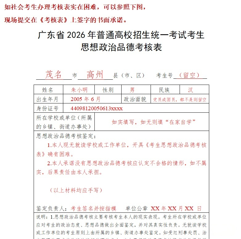 无就读学校或工作单位的考生如办理《广东省2026年普通高校招生统一考试考生思想政治品德考核表》确有困难,则由考生在现场确认时向报名点提供本人亲笔签字的书面承诺!