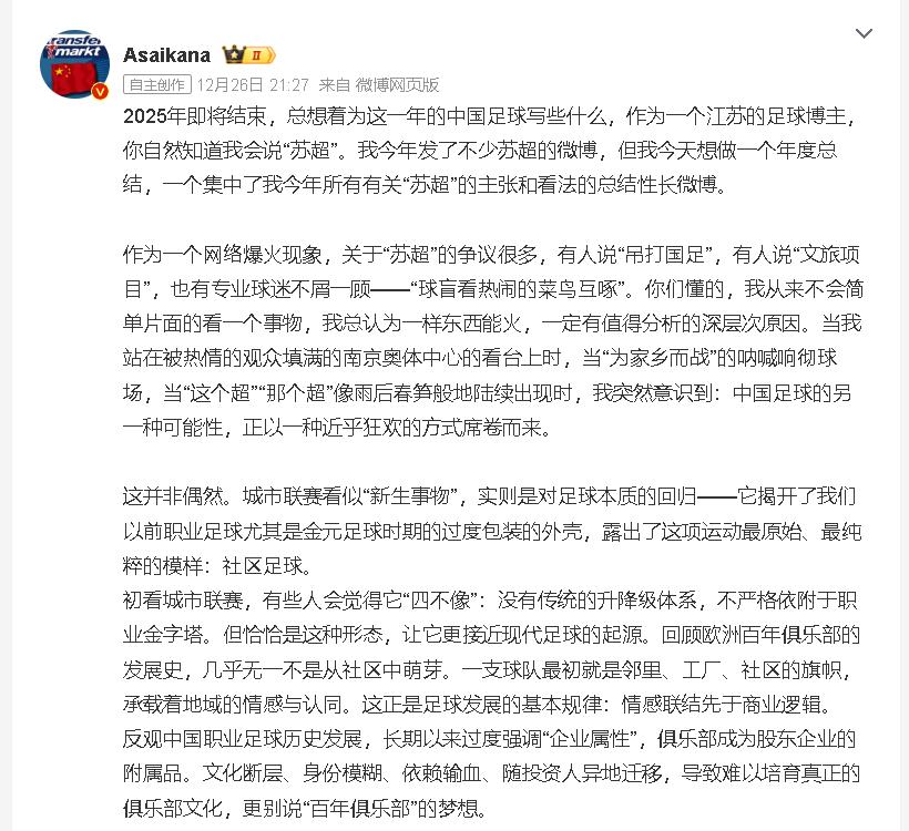 不过有人认为苏超不是真正的足球比赛,而是文旅项目推出的比赛,是球盲看热闹,可你见过哪个文旅项目能让南京奥体中心座无虚席,能让苏州、无锡、常州这些城市的球迷跨城追赛,能让这个超,那个超像野草一样在全国疯长?