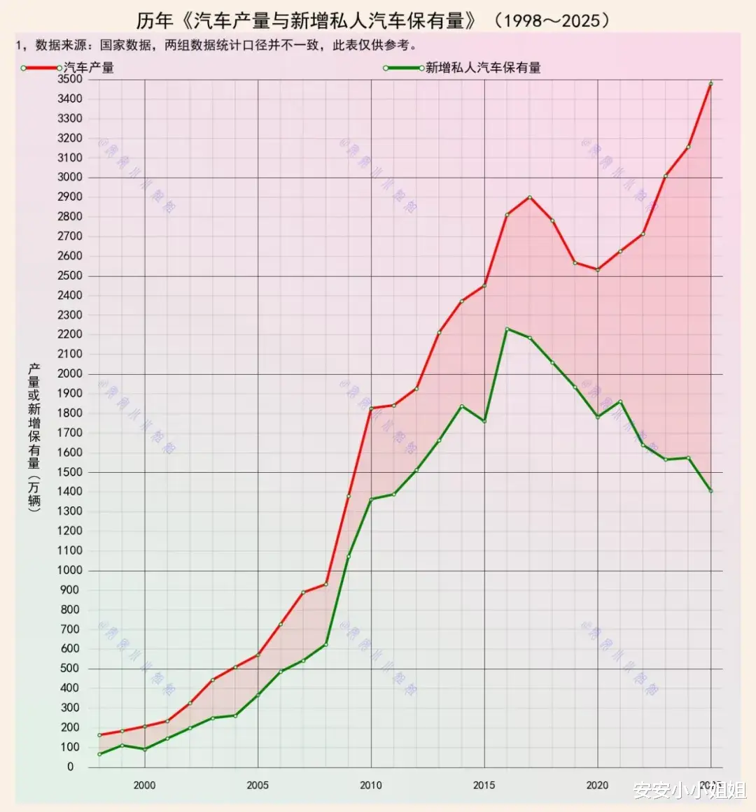 从 1998 年到 2025 年,汽车产量与新增私人保有量的差值,从百万级攀升至千万级,看似是数据的错位,实则是中国汽车产业发展的缩影。