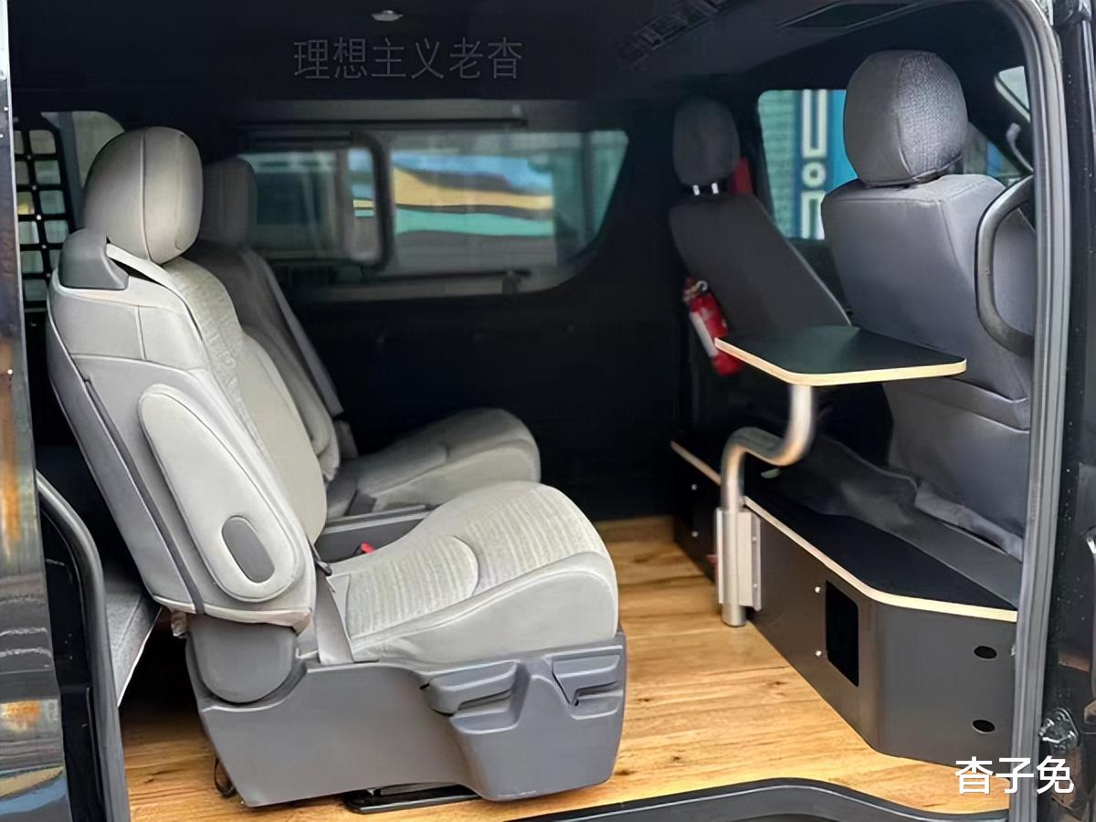 打开中门,车内实木打底,前排座椅后面放置了一个低箱,也可作为长凳使用,后面固定了一张旋转小桌,方便坐在后排座椅上喝茶吃饭。
