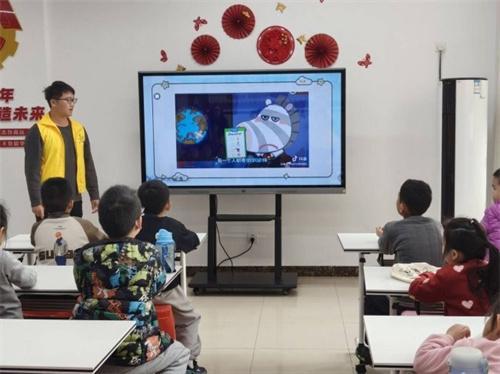 在活动开始前一周,实践队员身着队服,携带提前准备好的设备及道具来到了耕天下社区,有序布置活动场地,确保环境整洁安全,为后续开展绿色环保宣讲课堂做好准备。活动环节,实践队员向到场儿童说明活动目的,以“认识环保”为切入点,向儿童说明日常生活中保护环境的重要性。随后播放《小熊的环保故事》视频,教给儿童“随手关灯、垃圾分类”等保护环境的小技巧,同时帮助儿童树立“只有大家共同努力,环境才能变得更美丽”的观念。