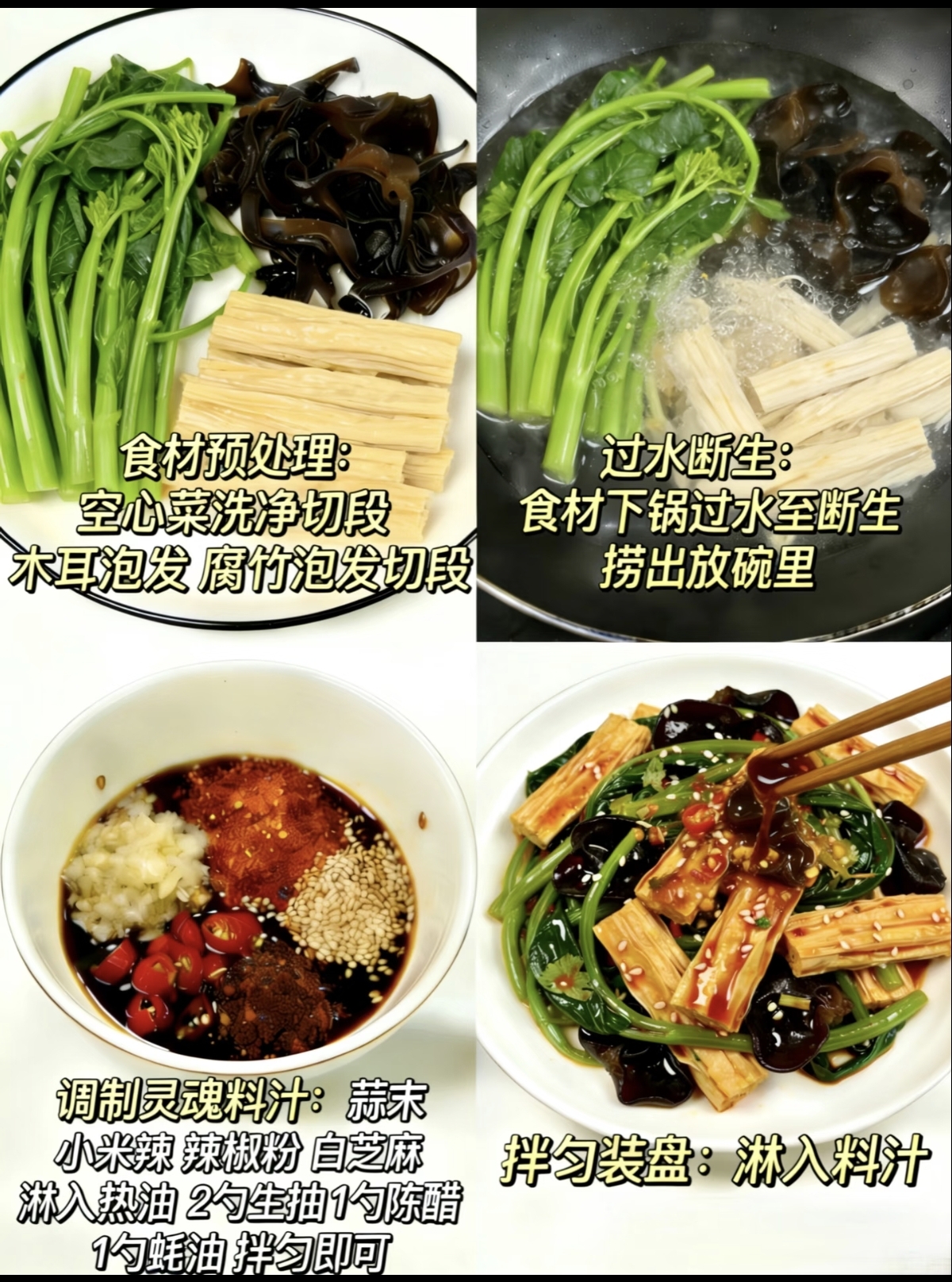 当夏日的热浪裹挟着城市的喧嚣,厨房里的灶火似乎都变得让人望而却步。在那些不想开火、不愿闻油烟的傍晚,一道凉拌菜便是对味蕾最温柔的救赎。凉拌腐竹空心菜,这道看似毫无攻击性的家常菜,实则是夏日餐桌上最懂人心的存在。它摒弃了繁复的烹饪技法,只用最纯粹的食材和最简单的调味,便在几分钟内编织出一幅清爽、鲜香、充满生机的夏日图景,成为无数家庭在炎热季节里的“解暑神器”。
