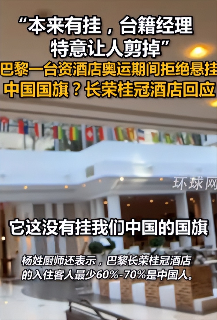 当时,一位大陆旅游博主下榻巴黎长荣桂冠酒店,意外发现酒店大厅里悬挂着几十个奥运参赛国的国旗,唯独缺少了我们的国旗。