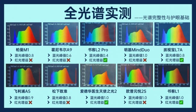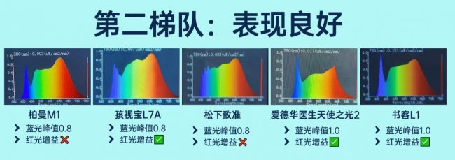 该梯队产品护眼表现合格,可以满足日常读写基础需求。其中,柏曼M1、松下致准蓝光峰值均为0.8,没有红光增益,但光谱连续性较好,无波段断层或强度失衡问题,不会因光谱缺陷引发明显视疲劳,属于无功无过的款式。孩视宝L7A蓝光峰值为0.8,且具备红光增益,在一定程度上弥补了蓝光控制方面的不足,对于长时间学习场景,视觉舒适度会更稳定一些。