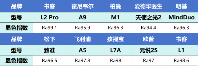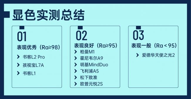 (1)第一梯队(Ra≥98):书客L2 Pro、孩视宝L7A、书客L1