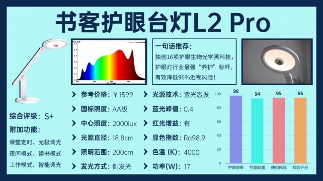 作为书客的旗舰力作,这款L2 Pro搭载16重生物光学黑科技,核心采用新一代紫光激发全光谱技术,从根源抑制有害蓝光,415~455nm波段蓝光峰值较国标RG0等级再减少70%,实现真正“0”蓝光护眼,同时补充有益天青光、绿光及婴幼儿视力发育所需红光波段。搭配自研RRT2.0红光养眼技术与全链路“3型分段”设计,精准适配不同年龄段视力需求,实测可降低96%近视风险、缓解92%用眼疲劳。第三代SDIT自适应调光系统配合112颗SunLux护眼芯片,每秒120次监测环境光并智能补偿,结合DT多维漫射2.0技术,实现99.8%自然光还原率与89%光线柔和度提升。参数与功能拉满,显色指数实测Ra98.9接近满分,符合RG0无蓝光危害、无可视频闪标准,支持80cm高度自由调节、45分钟定时休息、自动开关灯等功能,PLP光电处理器提升146%耐用性,综合性能与护眼效果处于行业顶尖水平。