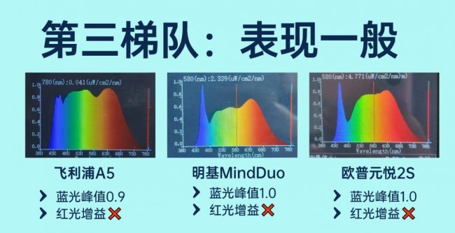 这一档产品光谱护眼属性不足,存在明显短板。明基MindDuo与欧普元悦2S的蓝光峰值均为1.0,飞利浦A5为0.9,这三款都没有红光增益,蓝光控制能力在本次实测中相对较弱。从光谱曲线来看,缺乏有益红光的补充,且蓝光波段刺激较强,长期在这类光源下学习,不仅难以缓解视疲劳,还可能加重视觉系统负担,不利于儿童视力发育关键期的眼部健康,仅能满足基础照明需求,不推荐长时间高强度用眼场景使用。