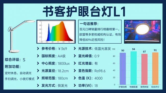 3.书客L1——百元旗舰・高性价比普惠型护眼台灯(学生党/租房党闭眼入款)书客将“医学用眼”理念下放至百元价位,是该价位段少有通过多国认证的品牌,成为百元档护眼灯的标杆产品。