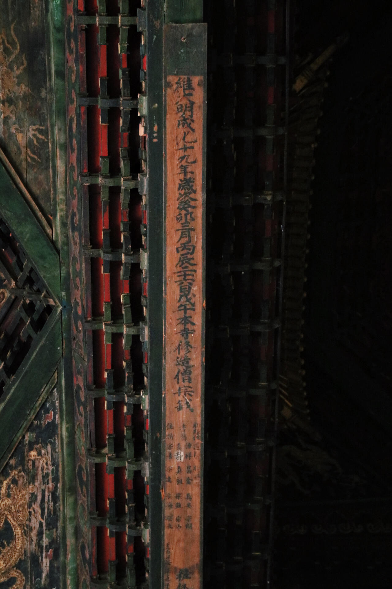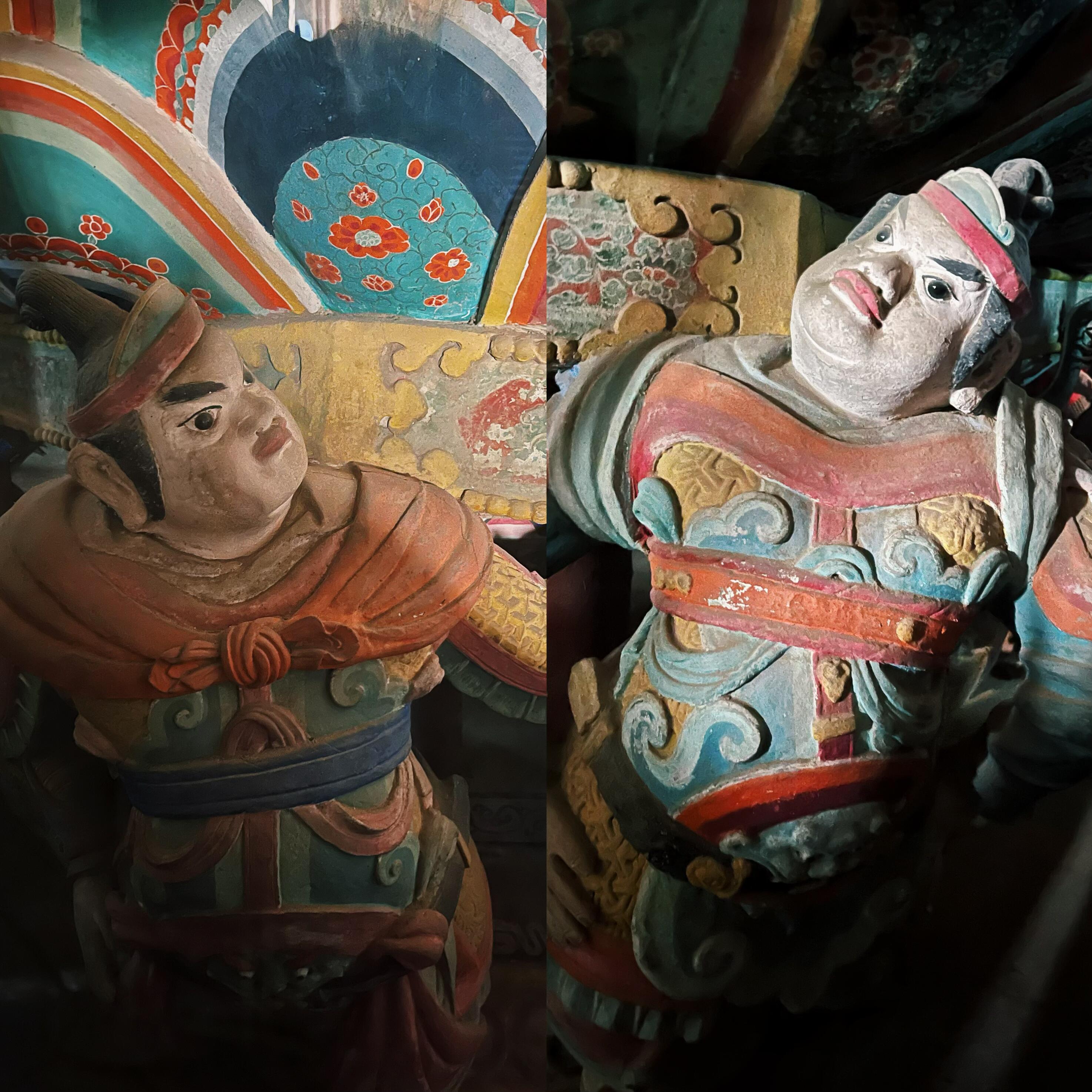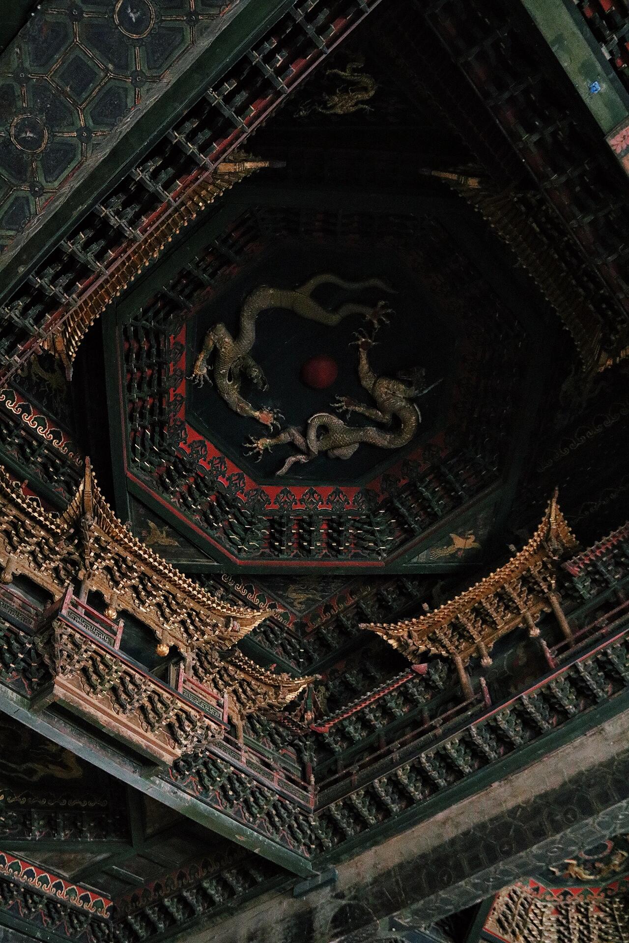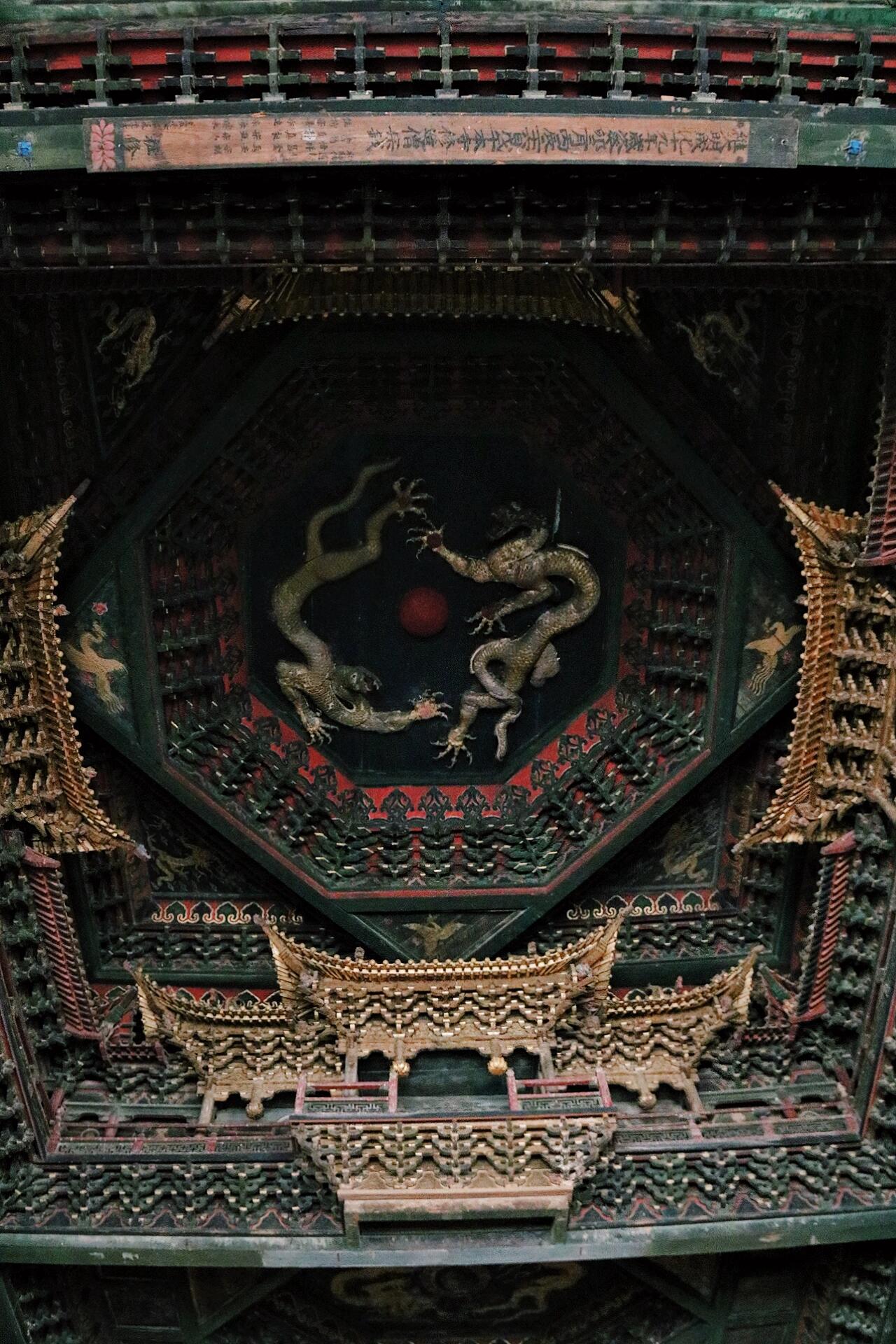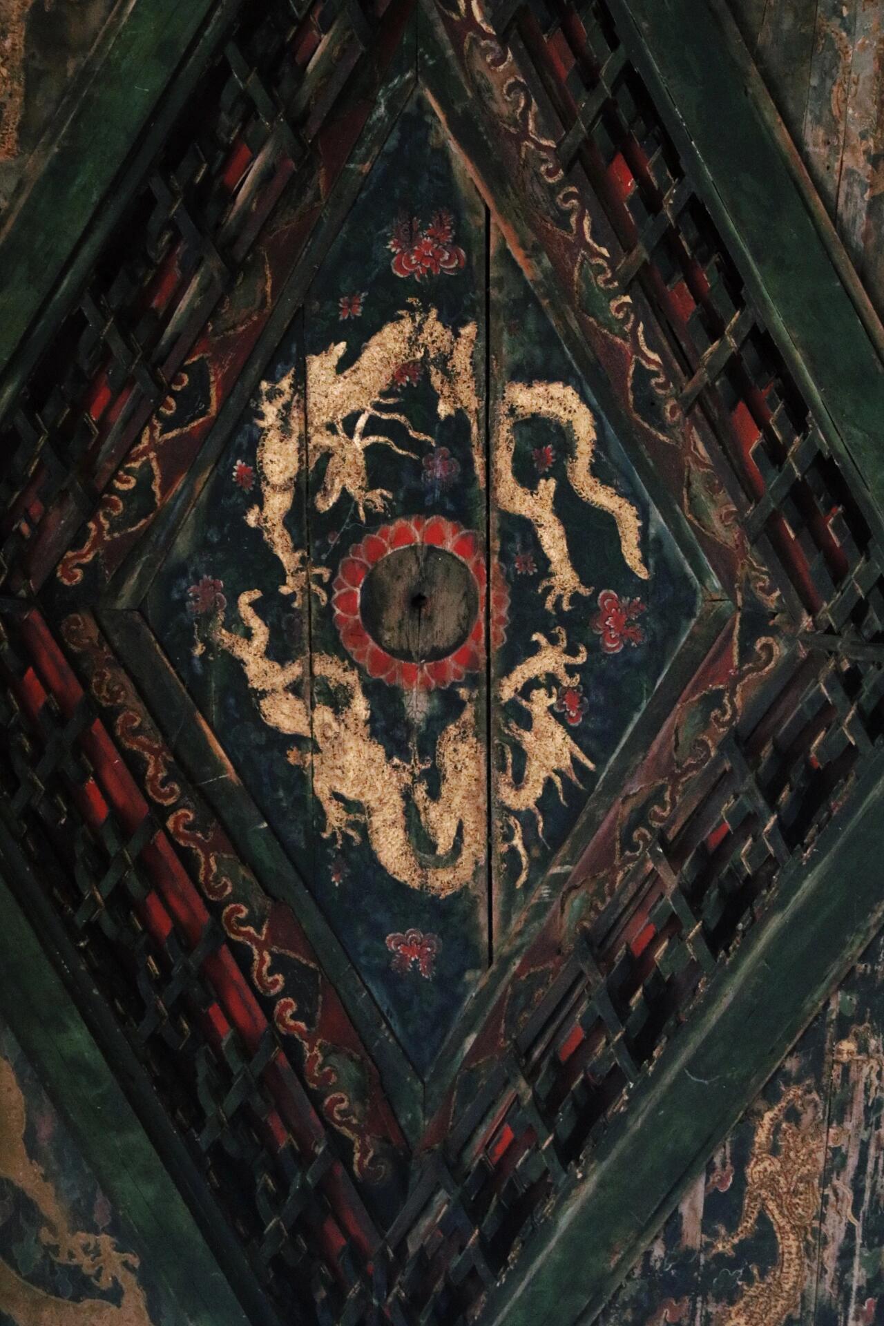 进入殿内,首先被震撼的是覆斗式天花构成的"天宫楼阁"。九块藻井以梁枋划分,中央藻井的双龙浮雕采用"压地隐起"技法,龙身鳞片清晰可数,四周的天宫楼阁以1:20的比例微缩再现,斗拱、勾栏、平座一应俱全,万余木构件层层叠叠,形成深达3米的视觉纵深。更值得关注的是,藻井彩绘使用的石绿、朱砂颜料,经检测为金代原物,虽历经八百余年,仍在幽暗的殿内泛着微光。