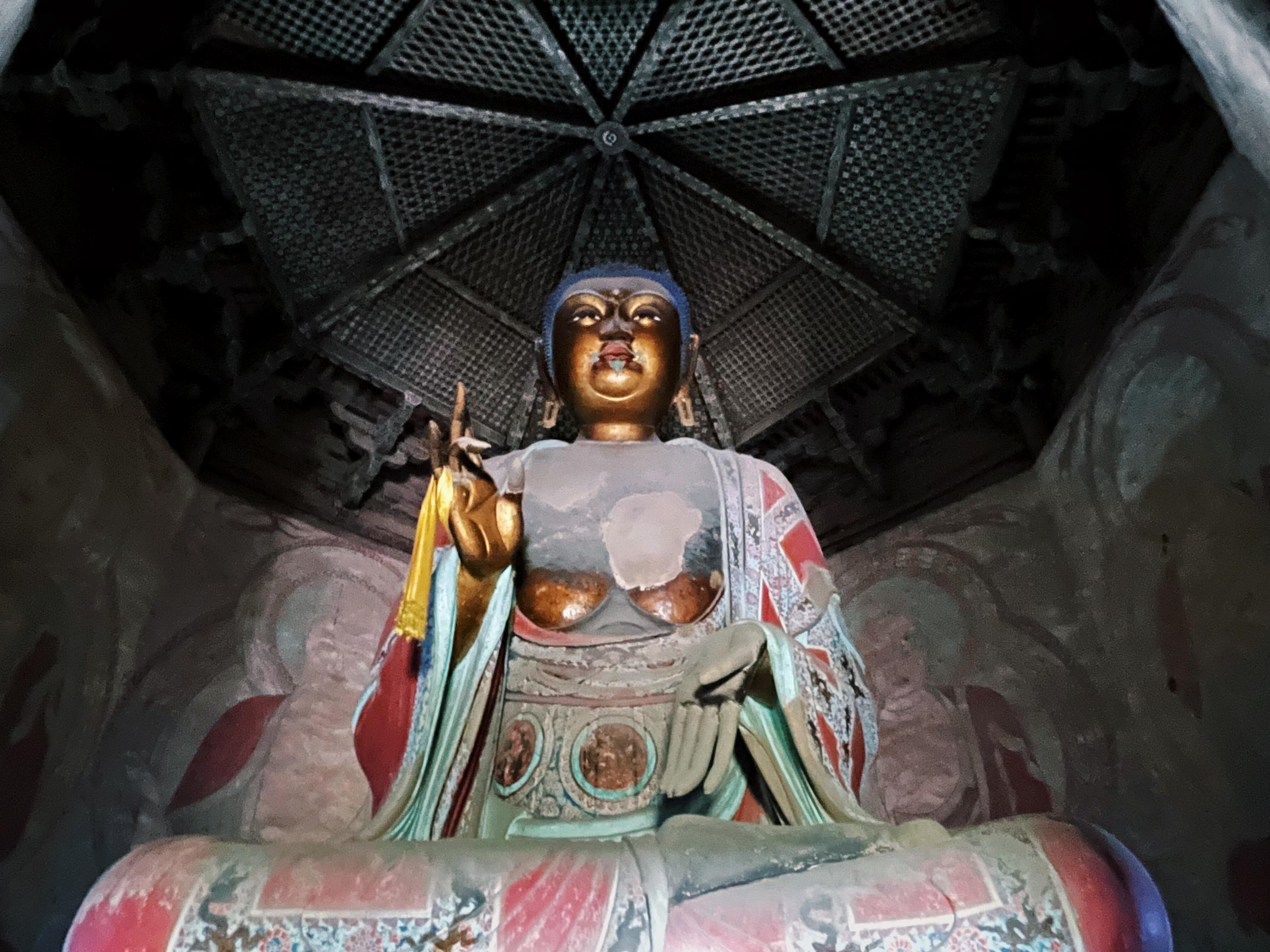 辽代建筑的雄浑气度在首层得以集中展现:直径3米的金柱直达二层,柱身微微侧脚形成"生起"效果,既符合视觉美感,又增强整体稳定性。柱间阑额上的"七朱八白"彩绘虽经后世重绘,仍可辨辽代"丹粉刷饰"的遗风。11尊辽代彩塑中,释迦牟尼佛头顶的藻井尤为精巧,八道垂脊汇聚成斗八形式,每条脊上的嫔伽、蹲兽均按《营造法式》规制排布,展现出辽代工匠对《周礼·考工记》的继承。