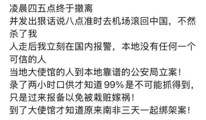 四五个小时后,绑匪终于走了,但走前撂下狠话:“八点必须滚回中国,不然杀了你!”