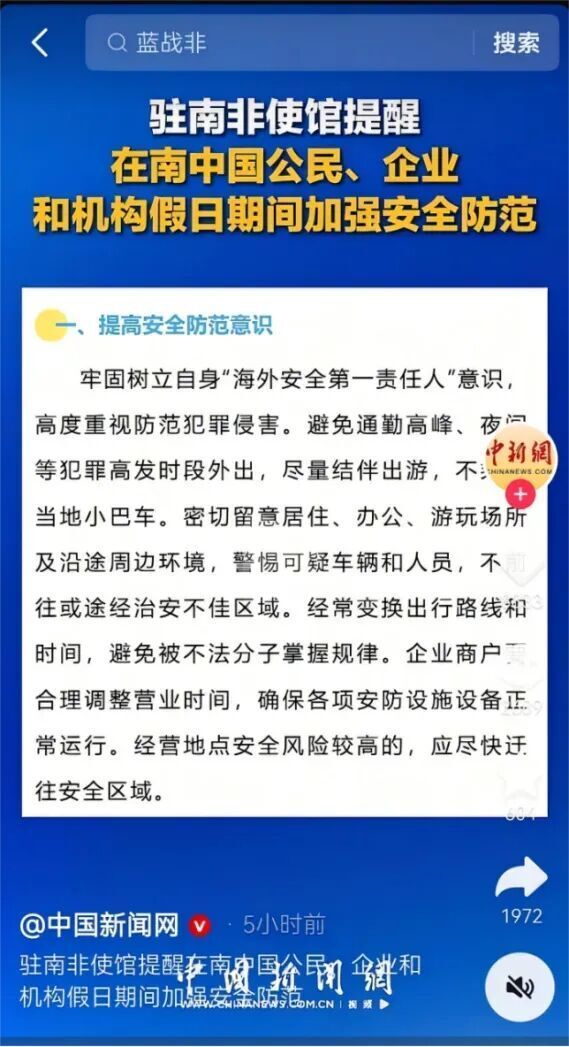 所以,早在今年6月,中国驻南非使馆就提醒过:“南非治安持续恶化,连续发生中国公民被绑架案”;12月4号,驻南非使馆又再次强调大家要加强安全防范。