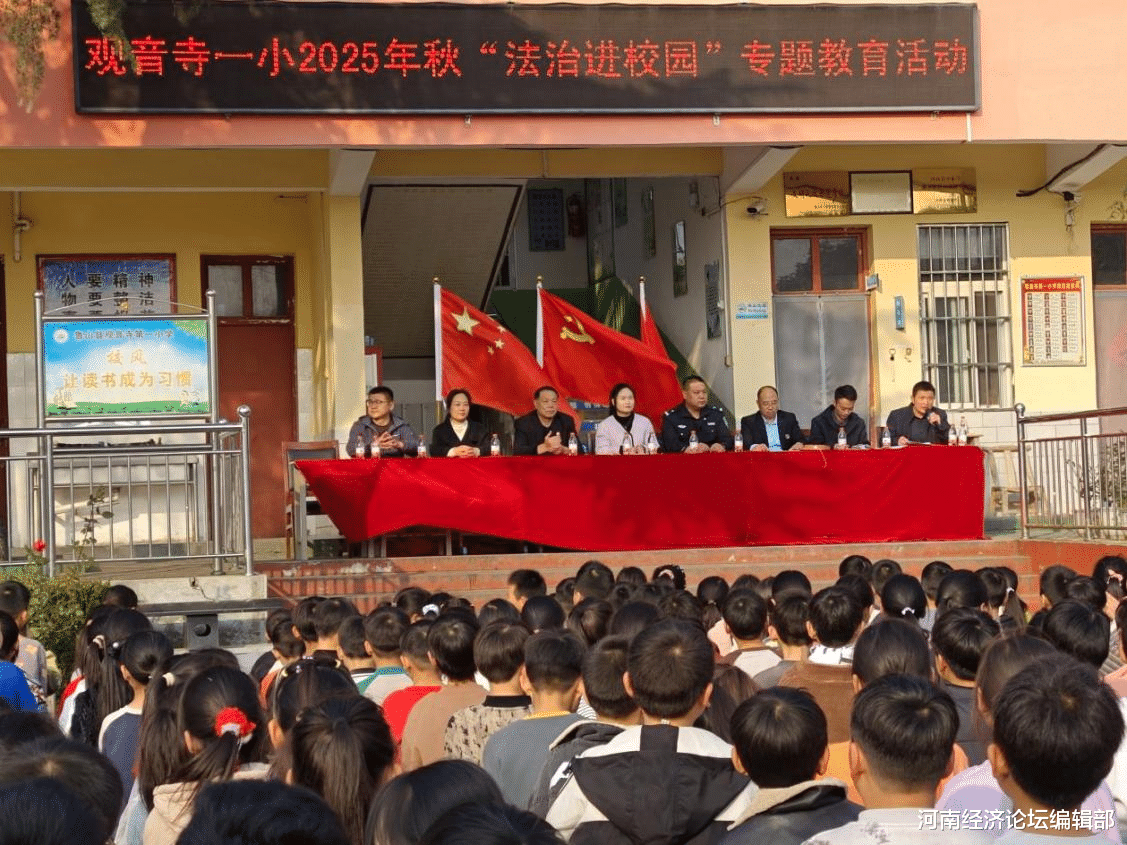 11月4日下午,秋阳正好,鲁山县观音寺第一小学的操场上暖意融融。近500名师生齐聚一堂,一场别开生面的“法治进校园”专题教育活动正在这里举行。观音寺乡平安办主任梁夏玮、瓦屋法庭原庭长党群、观音寺司法所所长罗洪斌、公安派出所副所长陈海彬等20余位嘉宾的到来,让这场活动更添分量。