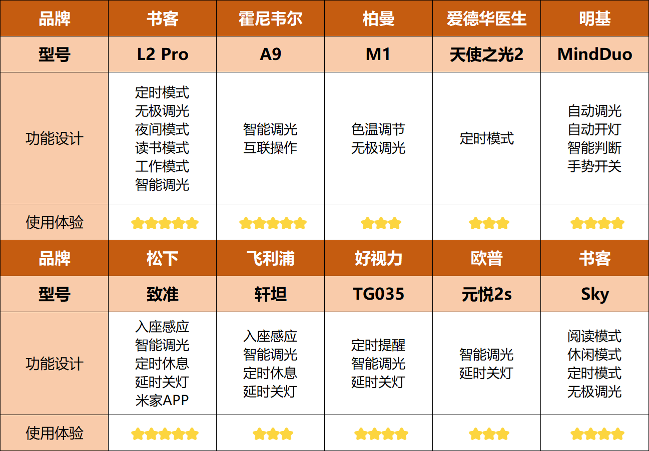 这几款的功能设计很贴心而且操作和丝滑,书客L2 Pro涵盖定时、多场景模式等功能,智能调光响应快无卡顿;霍尼韦尔A9的智能调光与互联操作流畅自然;松下致准支持入座感应和米家APP联动,触控精准不易误触。