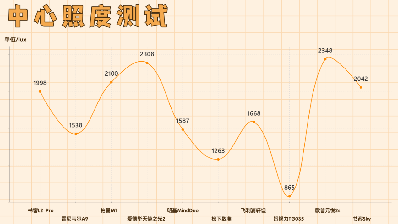 本次光线测试中,十款台灯在中心照度上均满足国AA级要求,但光线柔和度表现差异明显: