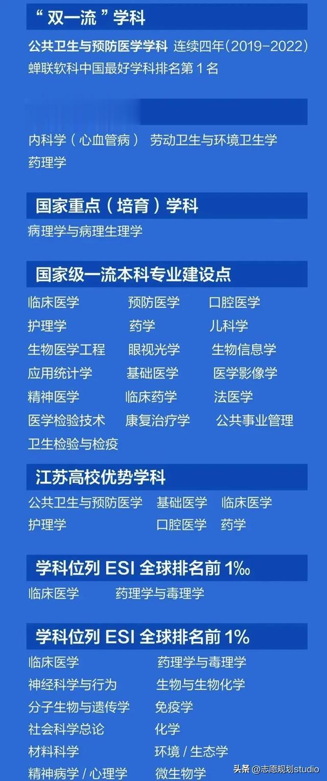 国家重点学科3个、国家重点(培育)学科1个、国家临床重点专科34个。13个学科位列ESI全球排名前1%,临床医学学科、药理学与毒理学学科位列ESI全球排名前1‰。