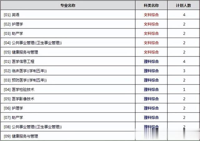 设有12个教学机构,开设临床医学、预防医学、药学、医学影像技术、护理学、公共事业管理、康复治疗学、医学检验技术等19个专业21个方向。每年选派一定数量优秀学生到南京医科大学等国内知名医科院校相关专业学习一年,为学生提供到高水平医科大学进行学习与交流的机会。