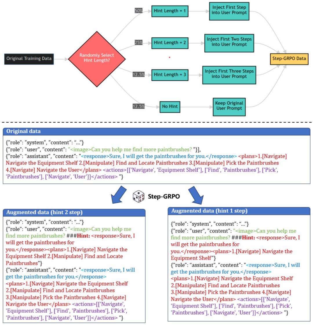 聚焦长程任务规划与输出格式标准化。针对传统强化学习在长序列规划中稳定性差、收敛慢的问题,创新提出 Step-Augumented Group Relative Policy Optimization(Step-GRPO)方法(图 4):在任务规划时,随机引入 1-3 步前置规划步骤作为「引导先验」(Guided Precursors),将复杂长任务分解为可逐步优化的子问题。例如在「寻找画笔」任务中,通过注入「导航至设备架」、「定位画笔」等前置步骤,帮助模型建立步骤间的依赖关系,提升规划连贯性。