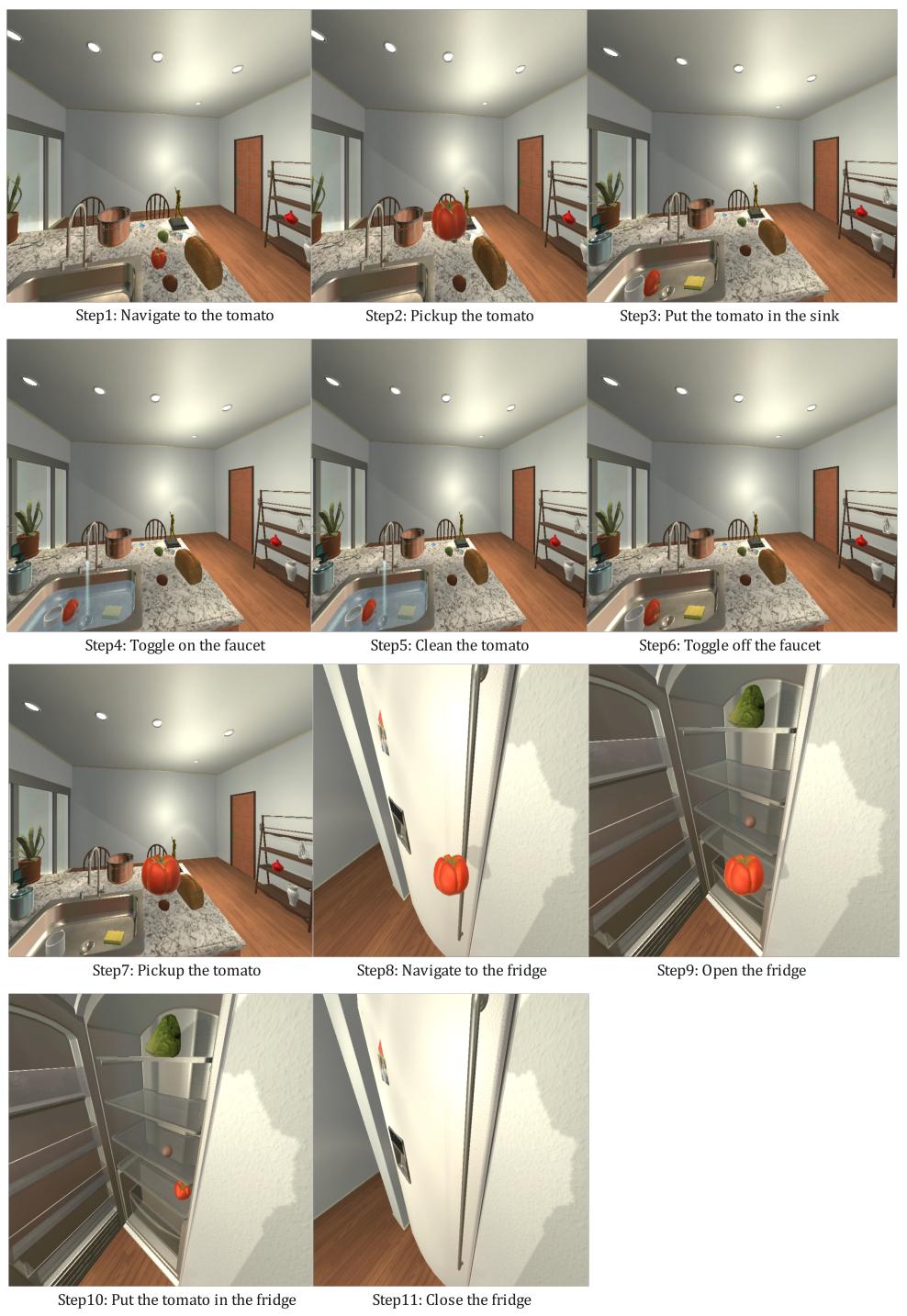 图 6:EmbodiedBrain 为「在水槽清洗苹果后将其放入冰箱」任务生成的成功 11 步规划定性示例。该模型正确识别并执行了两个连续子目标:(1) 步骤 1-6:获取物体、将其置于水槽并清洗;(2) 步骤 7-11:拿起清洁后的物体并将其存放在冰箱中。