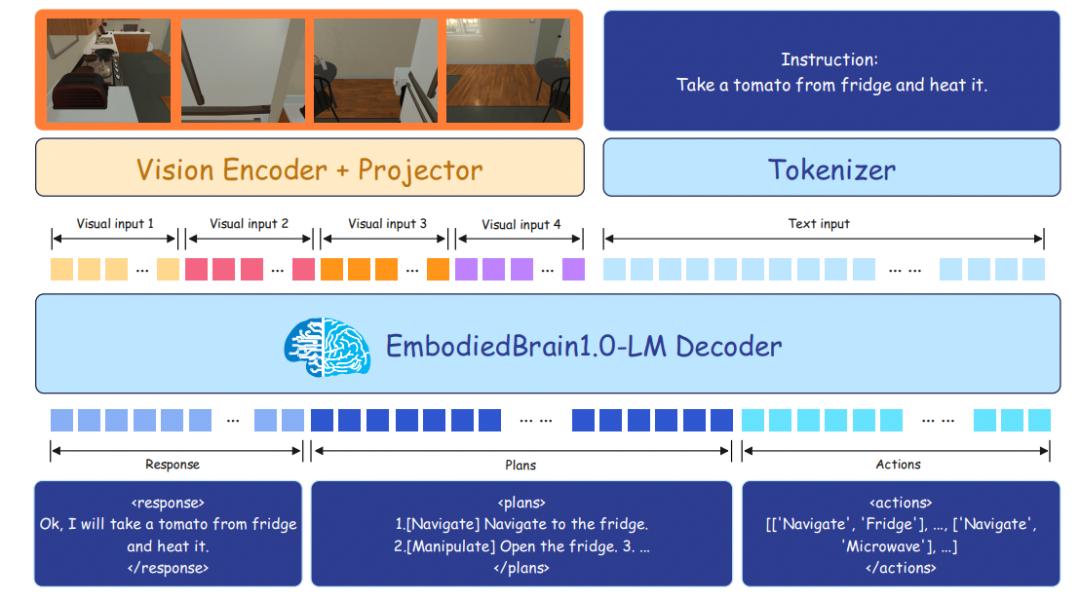 从工作流程来看,视觉输入首先经视觉编码器与 MLP 融合器处理,转化为与语言兼容的特征;文本指令经分词后与视觉特征共同构成多模态 token 序列,输入解码器;最终解码器输出包含三部分的结构化结果:response字段提供自然语言交互反馈,plans字段将任务分解为 [Navigate](导航)与 [Manipulate](操作)两类可解释步骤,actions字段以二元 / 三元组格式生成直接调用智能体 API 的可执行动作。