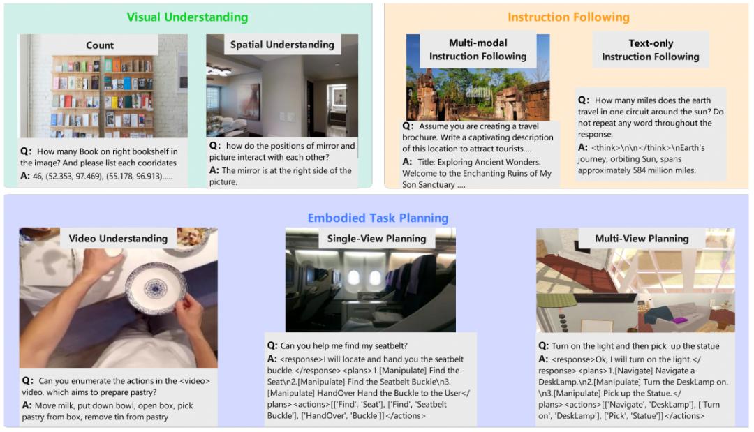 4. 视频理解数据:融合 Ego4D、Epic-Kitchens、EgoPlan-IT 三大数据集,生成「回顾性理解」(如「已完成何种动作」)与「前瞻性规划」(如「下一步应执行何种动作」)两类 QA 样本,并通过 Qwen2.5-VL-72B 过滤确保数据质量,提升模型对动态场景的时序推理能力。