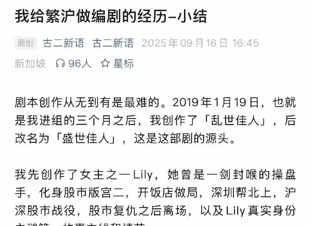 9月16日,有个叫“古二新语”的网友在网上发了一篇文章,讲自己是《繁花》剧本的创作者,可是却被人拿走了名字不说,还剥夺了署名。