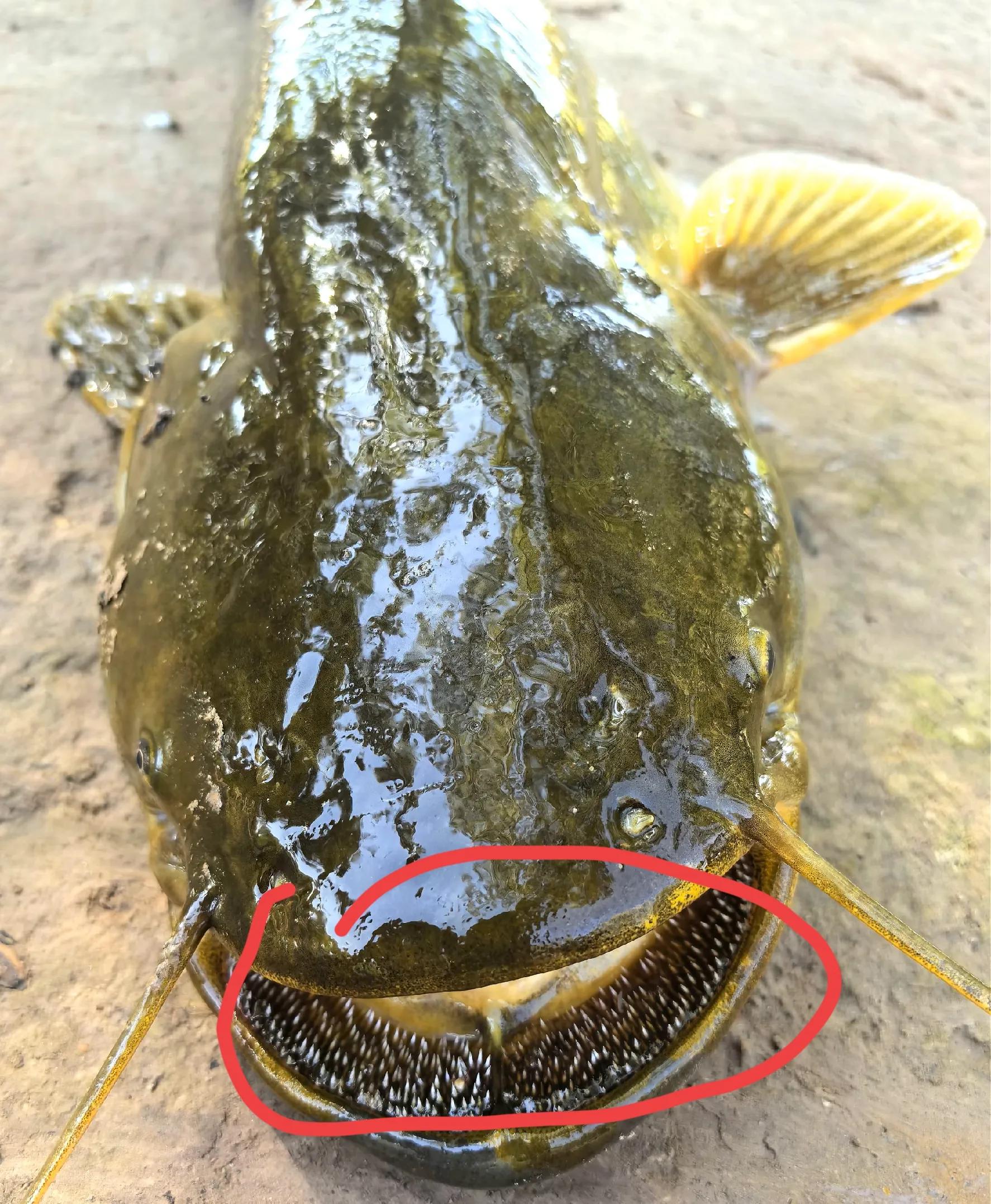 图中用红线花圈的位子,是大口鲶的鱼嘴上密密麻麻,像钢针一样的牙齿,锋利无比。