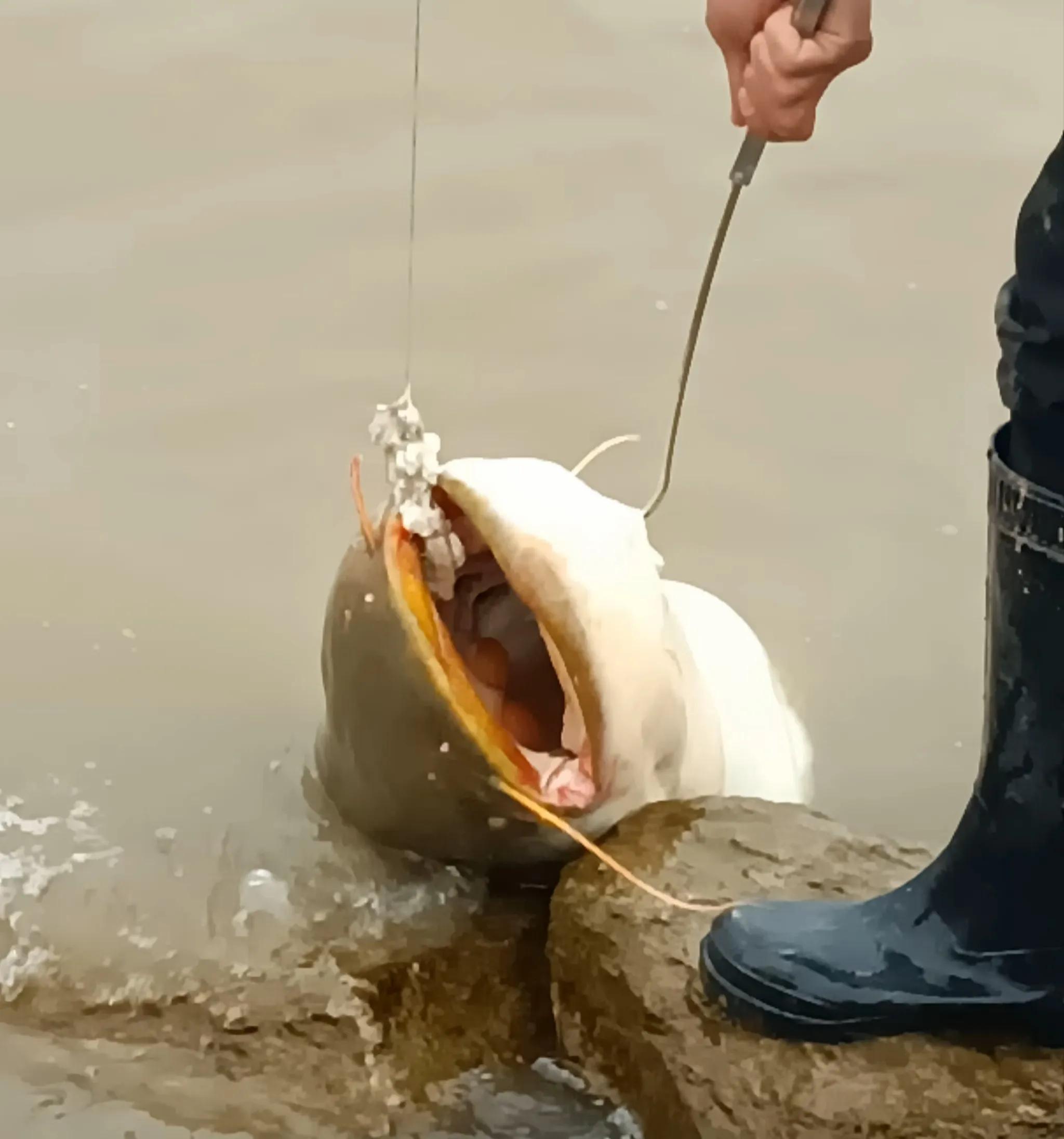 图片中被钓起的这条巨型大口鲶鱼,在我国的江河湖泊里,都是一方霸主的存在。