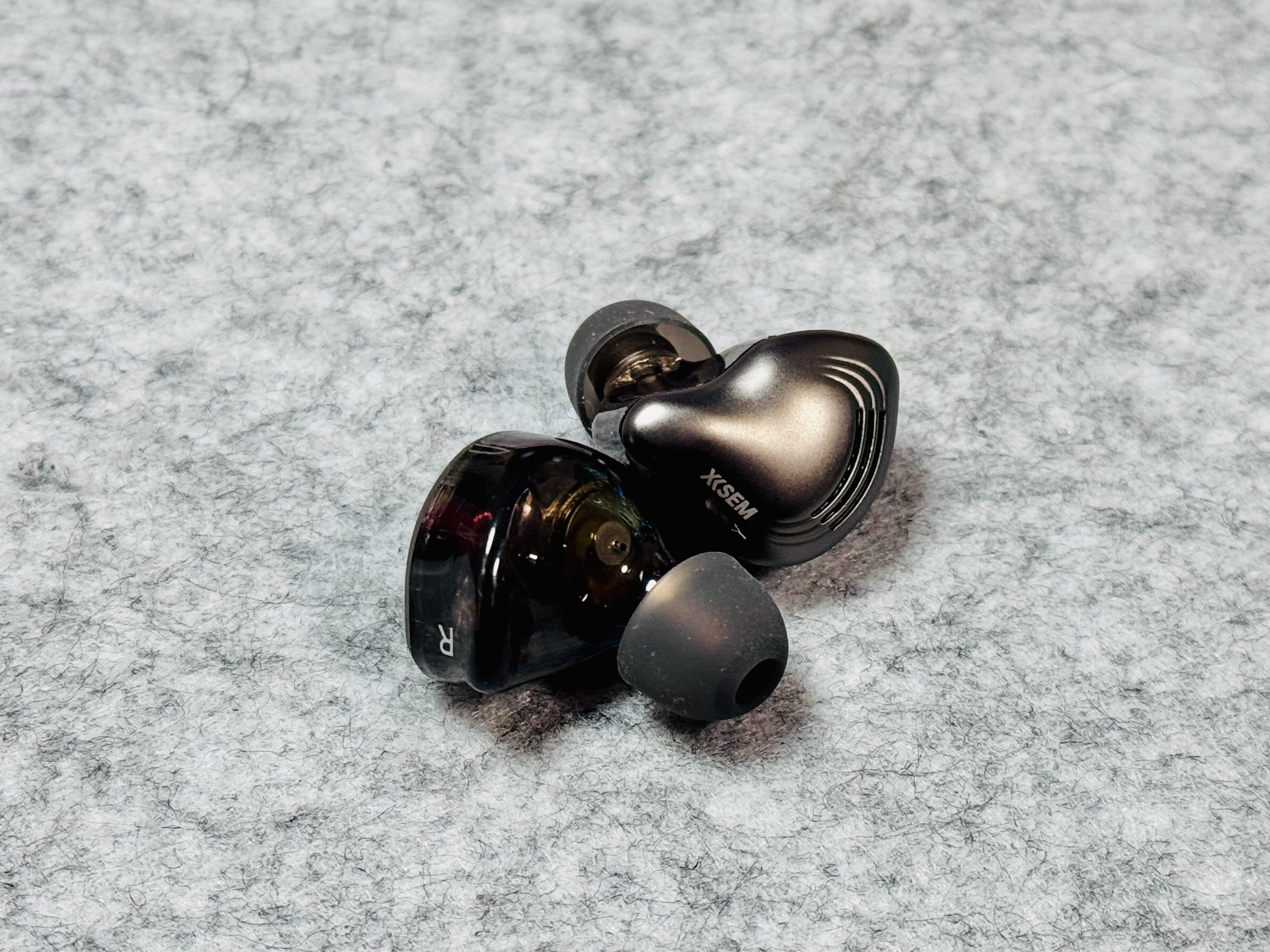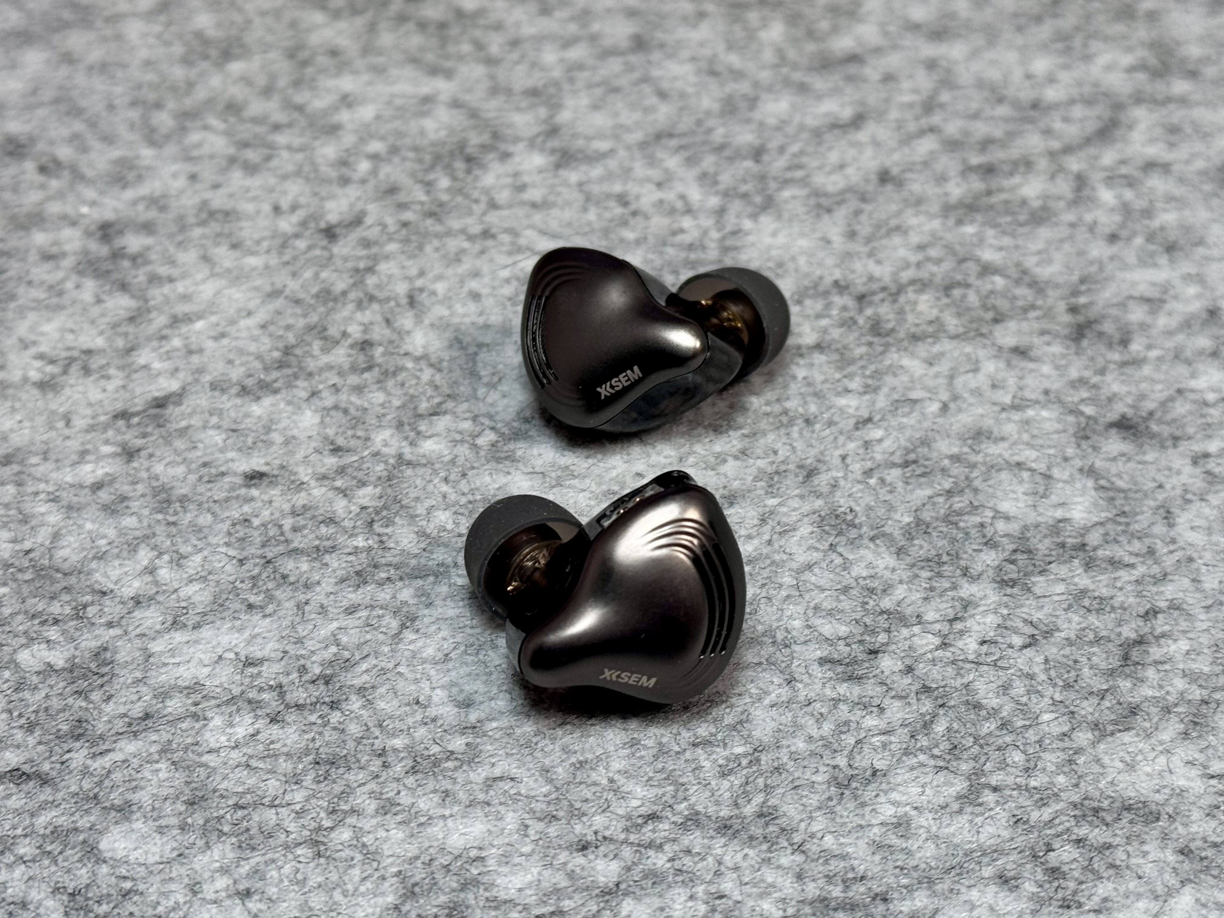 然后,每个耳机上面都有两个镀金2-pin可换线的接口,耳机外侧一层是咖啡色亮面材质,刻有西圣品牌logo,内侧一整个为透明设计,可清晰看到内部设计和动圈大小。