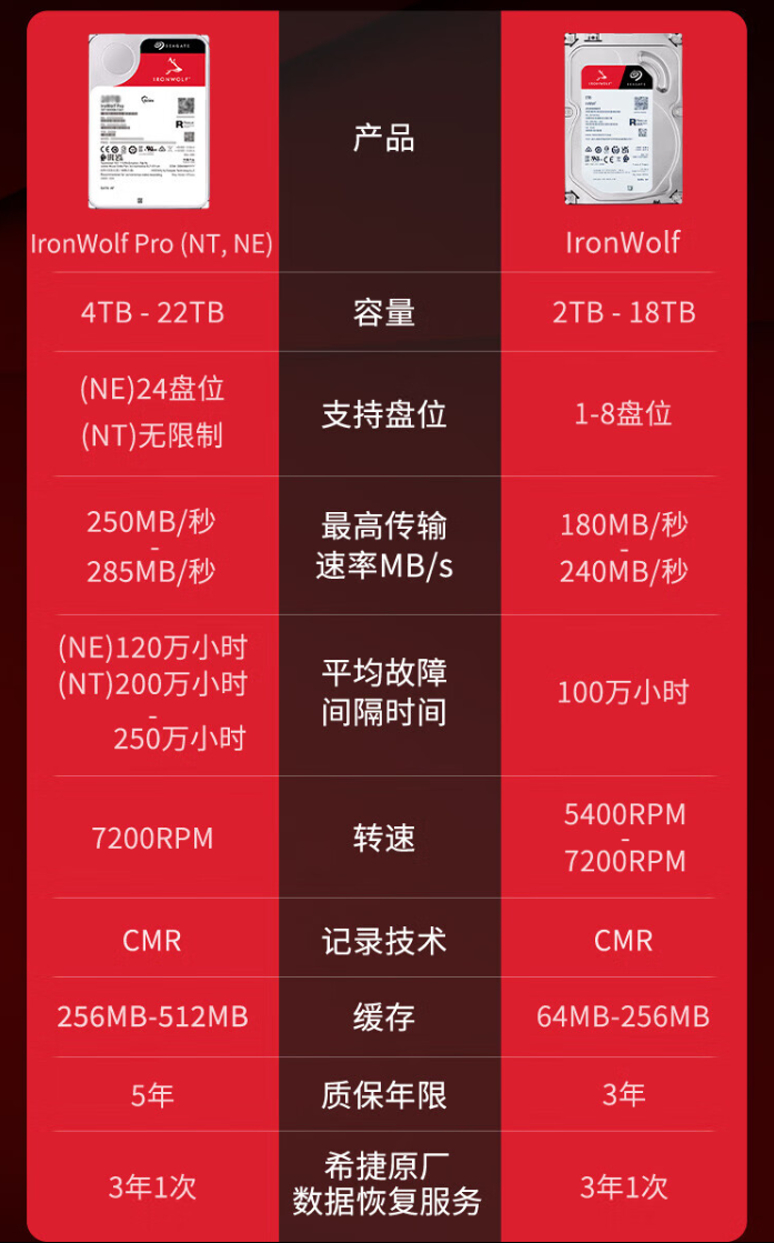 🔺需要说明的是,希捷的NAS专用硬盘分为酷狼和酷狼Pro两种,酷狼Pro不管是性能还是可靠性,以及质保都高于酷狼,至于价格嘛,你懂得~。