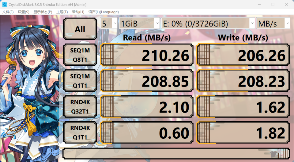 🔺在【CrystalDiskMark】测试中,希捷酷狼NAS硬盘连续读取速度为210.26MB/s,写入速度为206.26MB/s,符合官方宣传的范围值(官方给出的范围值是180--240MB/s)。
