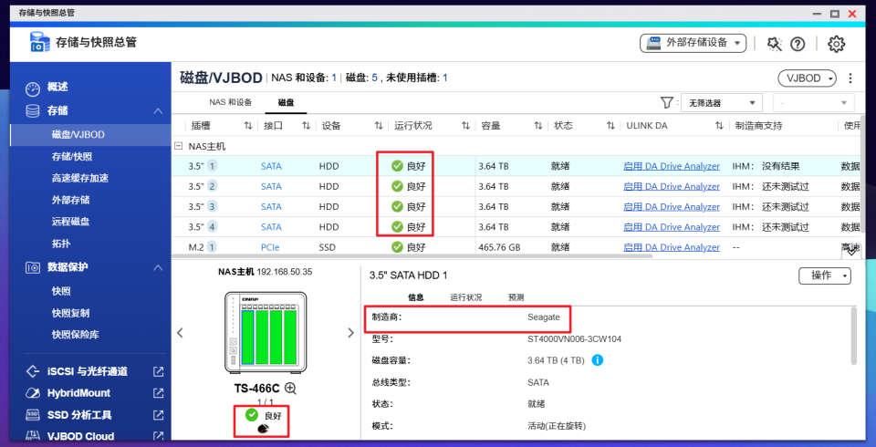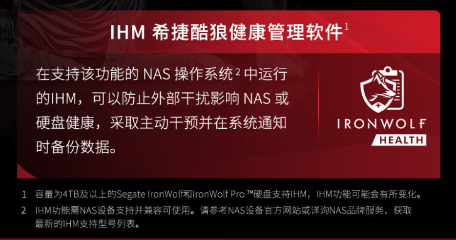 🔺还有就是市面多数常见NAS品牌都会内置希捷酷狼NAS硬盘独有的IHM希捷酷狼健康管理软件,该软件可以监控200余项硬盘指标的同时,监测各指标的历史变化趋势,更加智能地给出检测结果,实时预警,并在硬盘出现问题时快速定位故障源并给出针对性解决方案。