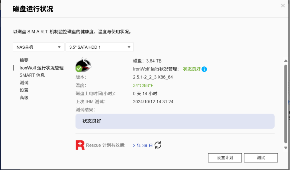 🔺接着就是希捷酷狼独家的酷狼健康管理软件检测,检测的信息还是非常全面的,包括温度,运行状况,甚至是希捷原厂数据恢复服务支持的剩余时间也都显示出来了。