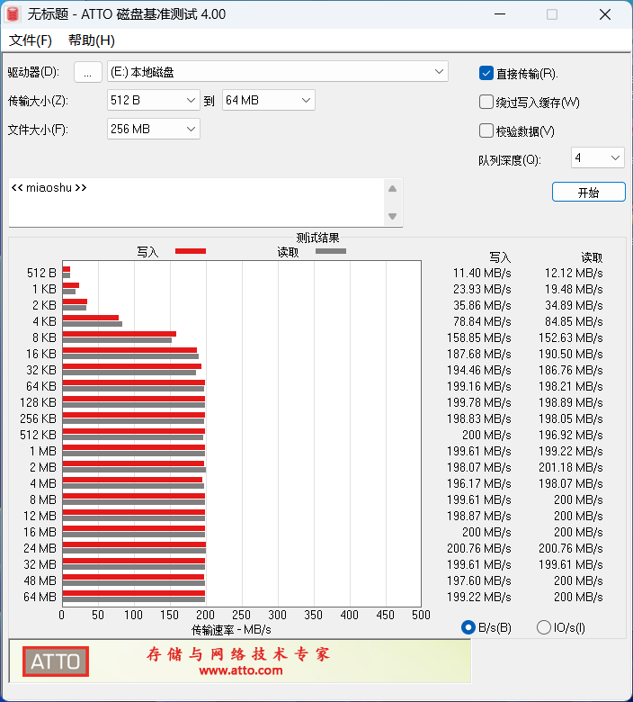 🔺再看看使用【ATTO磁盘基准测试】软件来测试不同大小的数据块下的性能,可以看出希捷酷狼 硬盘在大文件的最高写入速度也可以达到200MB/s,基本和上面测试的结果基本一样。