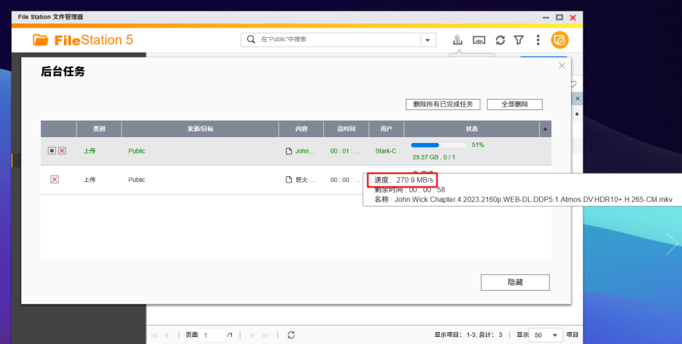 🔺我这里也测试了一个本地影视文件上传到NAS的共享文件夹,在Raid 0模式下,上传速度一直稳定在270MB/s,也就是说,这个速度直接达到了我威联通NAS 2.5G网口的上限,但并不是此时硬盘性能的上限,毕竟按照Raid 0的特性,我这4块酷狼硬盘传输速度可达800+MB/s。