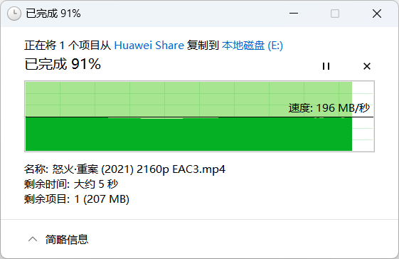 🔺最后来一个实际的拷贝测试,拖了一个大容量的影视文件,可以看出写入速度稳定在200MB/S左右。