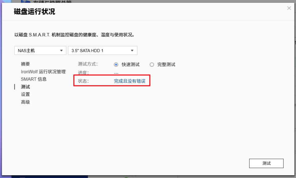 🔺先来进行S.M.A.R.T检测,S.M.A.R.T检测通过收集和分析硬盘内部的各种传感器数据,提供有关硬盘运行状况和潜在故障的警告,这里显示希捷酷狼硬盘是没有问题的。