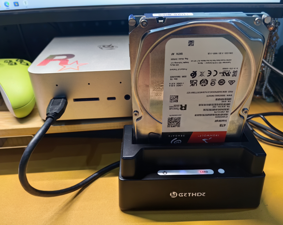 🔺上机时候通电可以看出四块硬盘全部都被正确识别,没有任何兼容问题。同时除了显示硬盘的容量,还显示了硬盘的制造商,甚至连酷狼的狼头标都显示出来了。