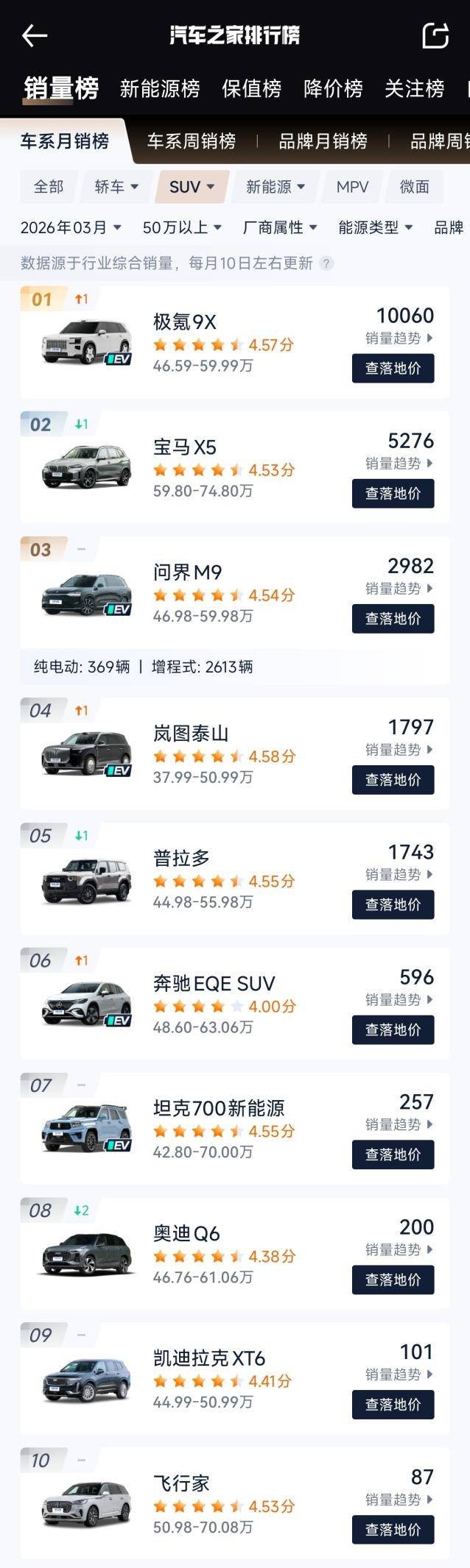 终于明白为啥那么多BBA车主都要转投极氪9X了。最新3月50万以上SUV销量榜,极氪9X卖出10060台,比宝马X5的5