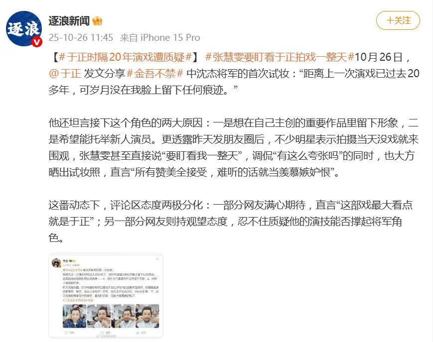 更耐人寻味的是剧集的宣发逻辑。试妆照发布当天,# 于正演将军 #的话题热度远超主演赵晴、周柯宇的相关词条,连张慧雯、吴谨言等旗下艺人都纷纷配合造势,张慧雯直言 “要盯看于正拍戏一整天”,这种 “配角捧主角” 的操作,被网友吐槽 “资源霸权太明显”。有业内人士透露:“与其说他想演戏,不如说这是场精准的营销 ——用自己的争议为新剧提前锁流。”