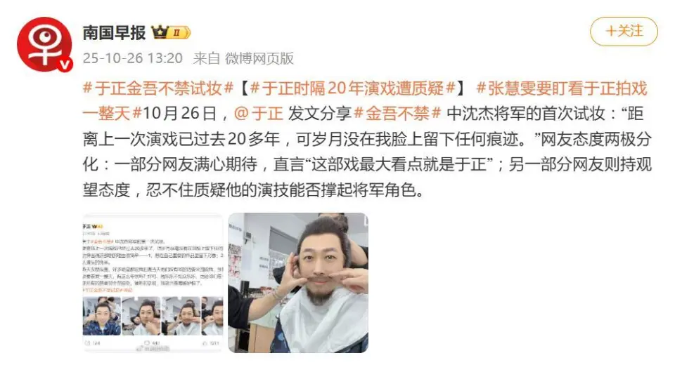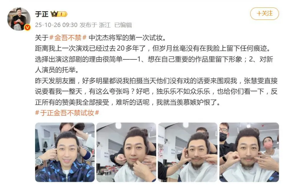 于正的演员复出之路,从一开始就自带话题火药味。在《金吾不禁》的试妆照里,他身着银色铠甲,面部贴满浓密络腮胡,眉眼间刻意营造凌厉感,配文高调宣称 “贴胡子后挺好看,岁月没留痕迹”,甚至直言 “很多人邀请我演戏,要演就演帅哥,不能演老头”。