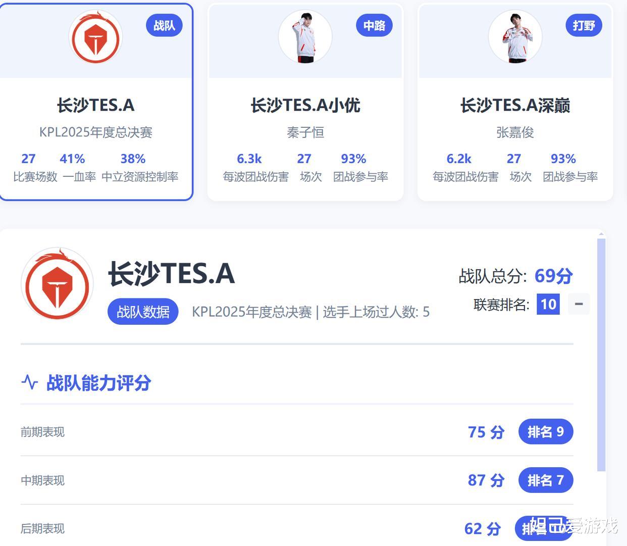 两队数据排名一览——根据KPL实时战力系统给出的数据来看,苏州KSG的战队综合得分为80分,排在联赛第七的位置,而长沙TESA的战队综合得分为69分,排在联赛第十的位置,从战队的综合得分情况来看,其实两支队伍的综合得分都不算特别高,特别是长沙TESA,相当于倒数第三。