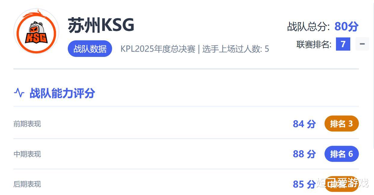 翻看苏州KSG战队的能力评分会发现,这支队伍的评分表现确实会好不少,不仅战队总评分80远高于TESA的69,其前期、后期能力也都排在了联赛第三名的位置,这个数据就非常有趣了,因为这刚好是TESA的短板所在,因此从年总现有的数据来看,KSG是要明显强于长沙TESA的。