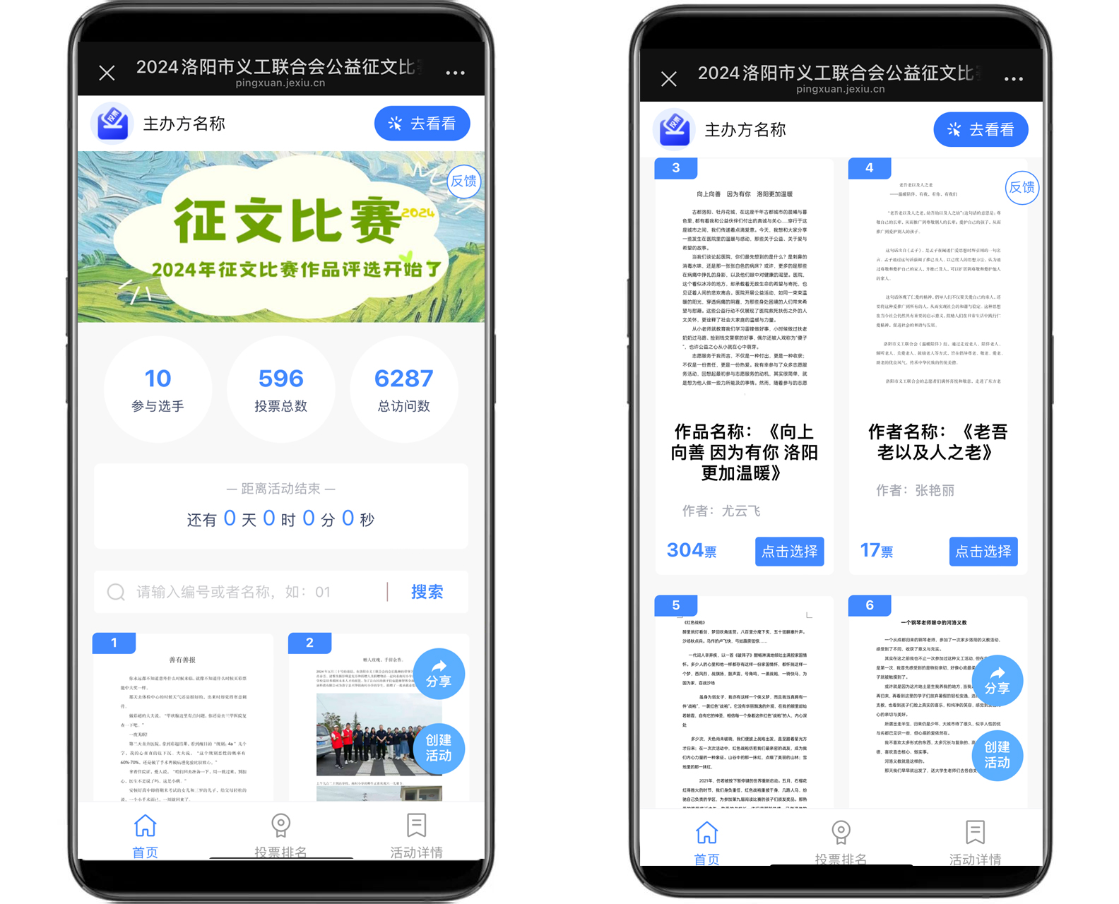 选手上传征文作品至线上投票评选活动,通过大众评选等方式评选优秀作品。