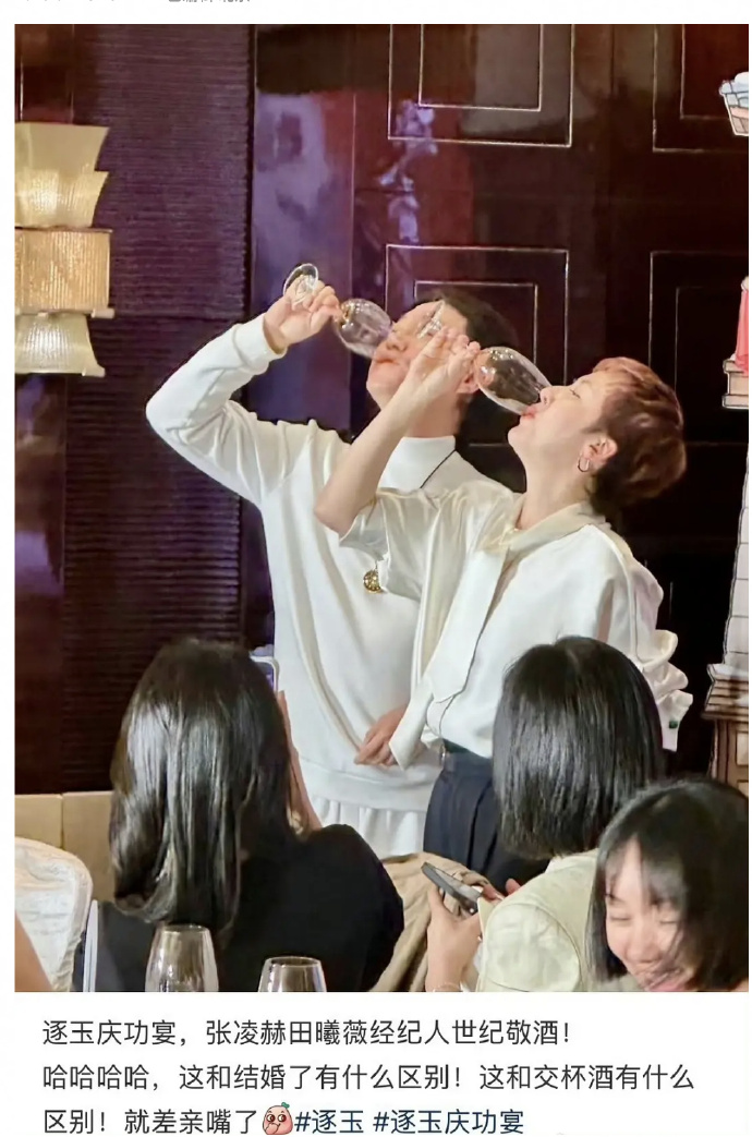 4月13日,爆款古装剧《逐玉》举办庆功宴,张凌赫、田曦薇等主创全员集结,共同庆祝这部剧双平台热度破万、Netflix全球出圈的好成绩。就在庆功宴的敬酒环节,张凌赫的经纪人徐以若(众星时代创始人),与田曦薇的经纪人公钰涵(浩瀚星缘老板),身着同色系白色正装亮相,并肩走向主创席举杯碰杯,这一幕被现场观众抓拍下来,瞬间引爆全网。