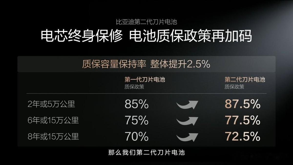 在政策上为了给用户吃一颗定心丸,比亚迪郑重承诺,第二代刀片电池电芯终身质保,电池容量提升2.5%,即原来75%的电池容量,现在变成77.5%,低于该容量则可以享受免费包换服务。