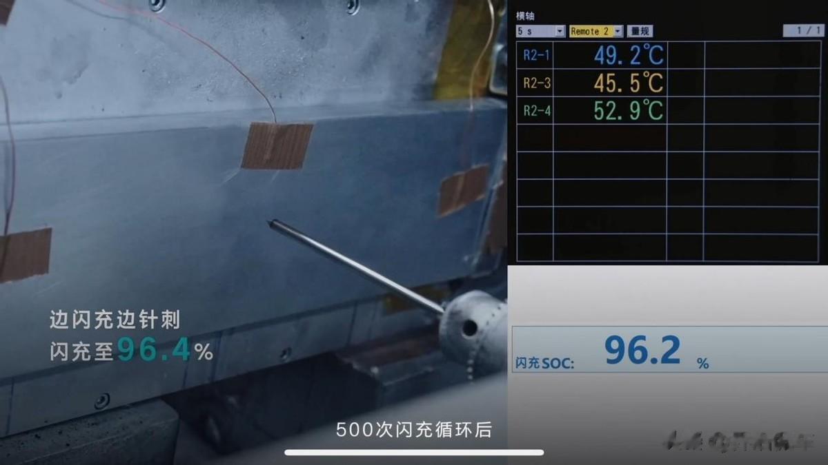 500次的闪充过后的电池,约等于行驶了30万公里,使用了近15年。在这样一种工况下, 电池边闪充边穿刺试验,结果是没有热扩散、没有起火,更没有爆炸。