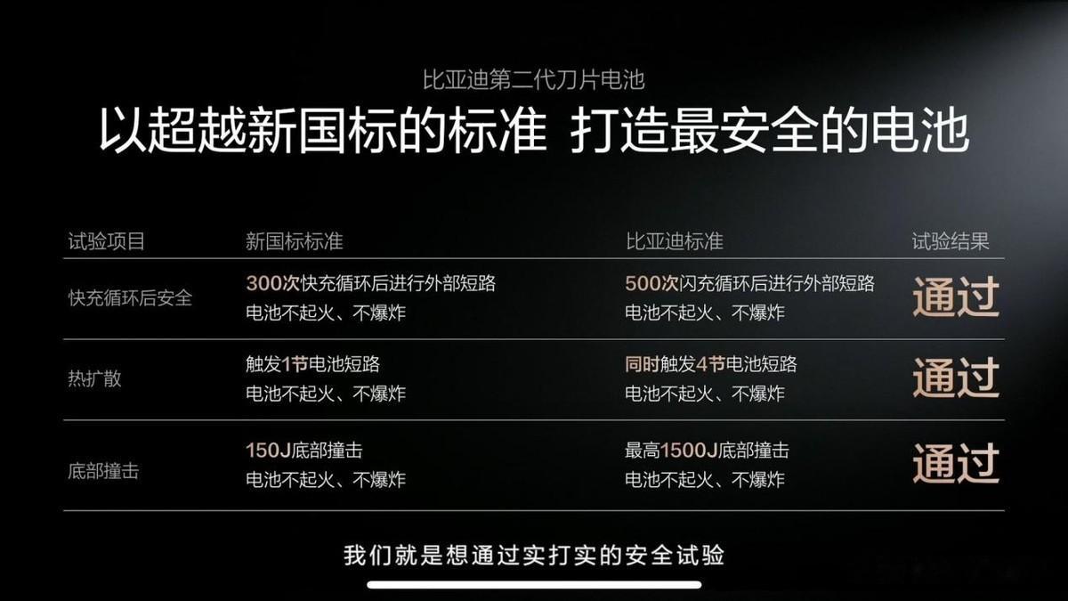 安全方面,比亚迪重点做了三个试验:500次闪充后的穿刺试验、电池短路后的热扩散试验以及电池底部撞击试验。