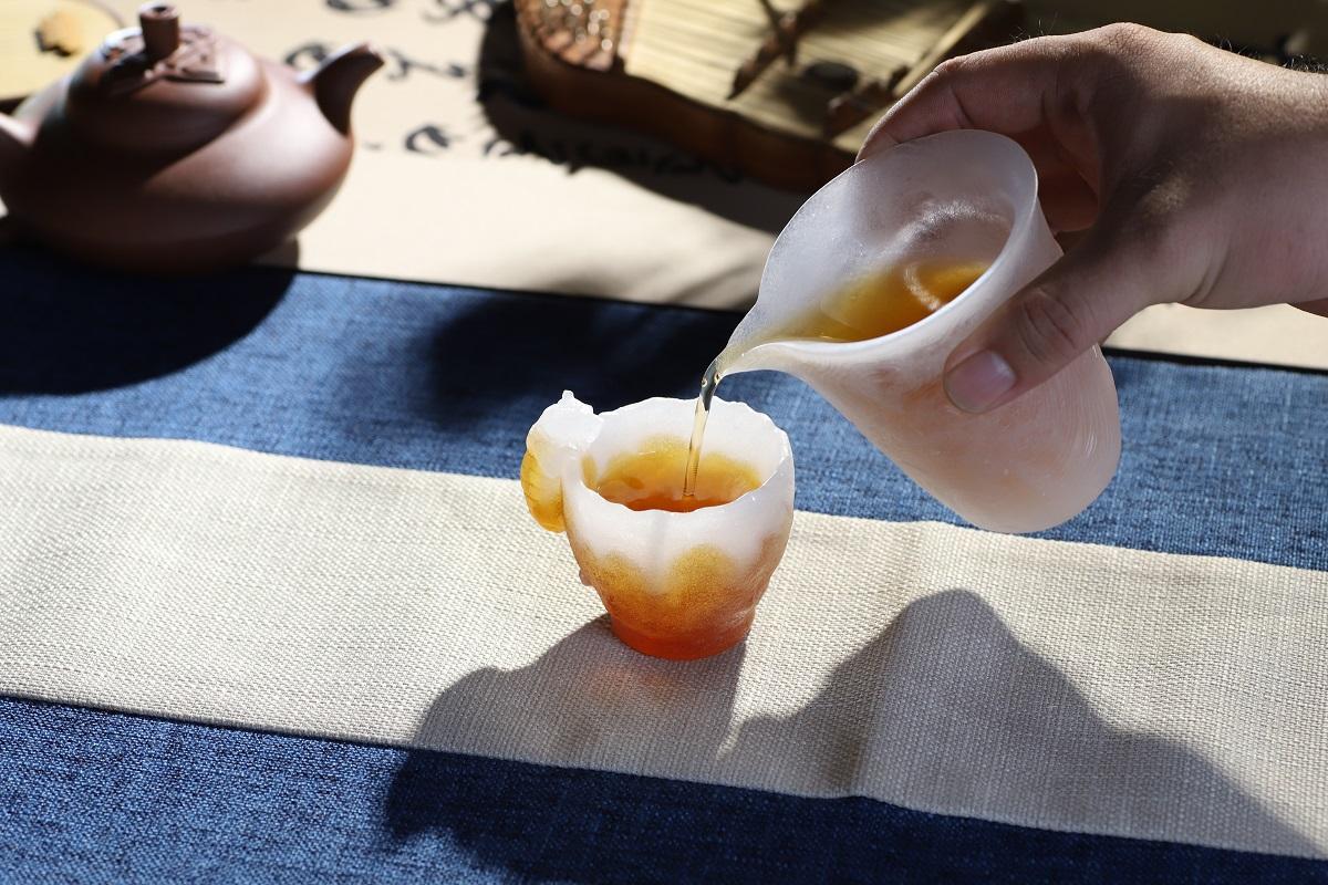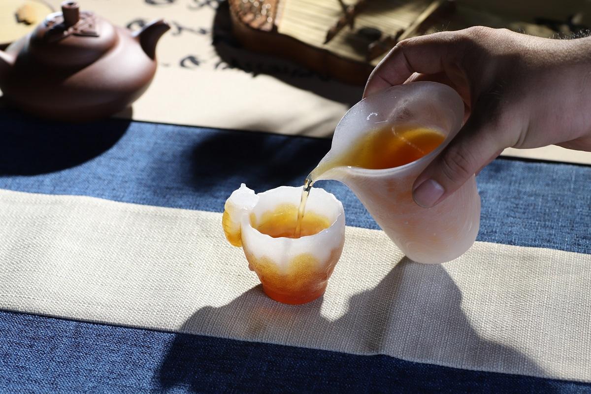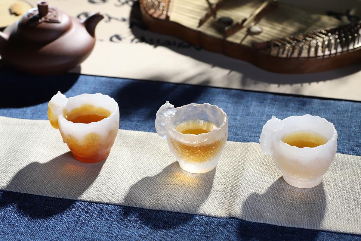 自然光洒落时,琉璃杯身通透莹润,注入茶汤后,茶色与琉璃柔光相互映衬,虎形轮廓在光影间若隐若现,氛围感静谧雅致。用它品茗饮茶,不夺茶香、不损茶味,独饮时可抚平浮躁、静心安神,待客时也尽显别致巧思与文化底蕴。